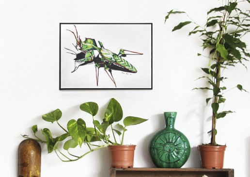 The Devil’s Flower Mantis (Idolomantis diabolica) can grow up to a maximum size of 13 cm, and is native to the Eastern part of Africa. It’s also a popular pet, especially in the western hemisphere. Anni was interested in the huge size of this species, and the spectacular colors. She thinks mantises in general look like they know something you don’t; some hidden wisdom behind the murky look.